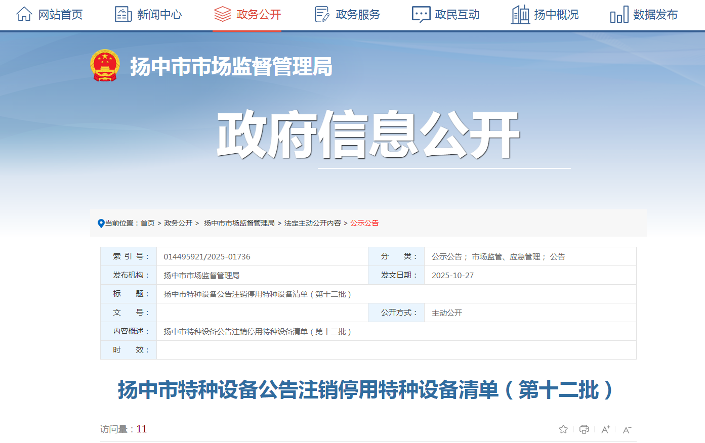 扬中市特种设备公告注销停用特种设备清单(第十二批)